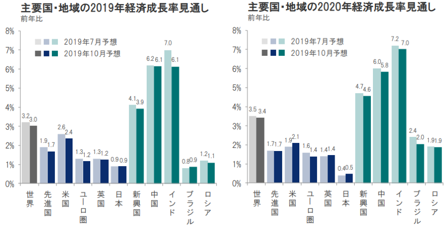 理由を探るために幅広く情報を確認していきます。国際通貨基金(IMF)は、2019年10月に最新の世界経済成長率見通しを発表しましたが、2019年と2020年の世界経済見通しを前回発表時(7月)から下方修正しました。しかし、 2020年の経済成長率見通しを見ると、米国は利下げと財政政策への期待から2.1%と、前回の予想から0.2%上方修正されています。ここから想像できることは、投資家は世界的に景気減速が見込まれるなかで、米国経済の力強い成長に期待をしていることが挙げられます。