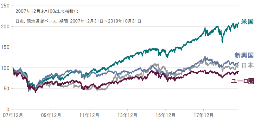 他国・地域と比べてみると、米国の株価だけが大きく上昇していることが分かります。2018年後半からは米中貿易摩擦や金融政策を巡る思惑の影響から変動幅は上昇していますが、それでも上昇傾向に変化はありません。