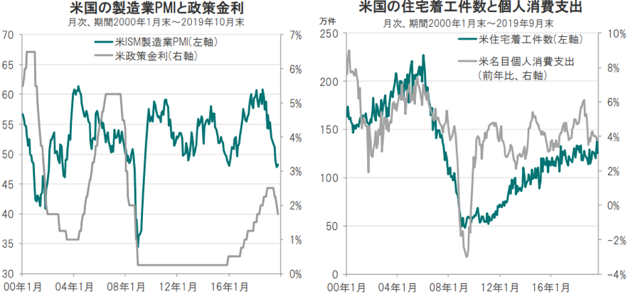 GDP成長率という観点では米国経済は好調を維持しそうですが、他の経済指標も見ていきましょう。たとえば、米国の製造業の景況感を示す指数ISM製造業PMIを見てみると、2018年の夏頃から米国の製造業の不振が続いていることが見てとれます。しかし、米国連邦準備制度理事会(FRB)が10月29、30日に連邦公開市場委員会(FOMC)を開催し、政策金利を0.25%引き下げることを決定しました。これは製造業の不振が更に悪化することに対して予防的な観点からの利下げと考えられます。
