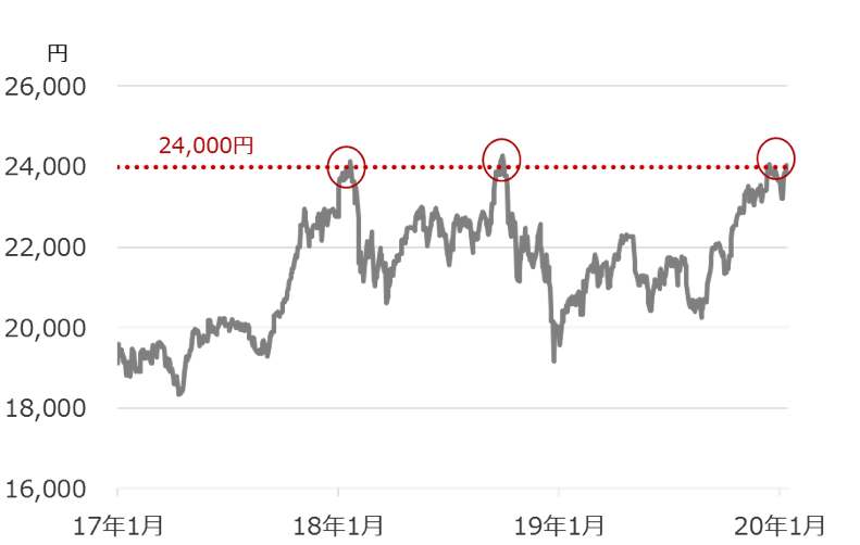 過去3年の動きを見ると、日経平均株価の24,000円水準は重要なポイントとなっていることがわかります。日経平均株価は24,000円水準には到達するものの、その後はその水準に定着せず、上昇の勢いが弱まる傾向がありました。こうした動きから、同水準では「株価はもうあがらないだろう」と考える投資家が多くなり、株式を売却する傾向があるといえ、同水準は株価上昇の大きな壁になっていると考えられます。