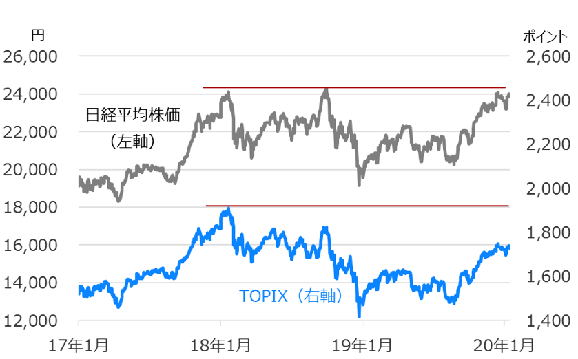 2020年の日本株式市場は波乱の幕開けとなりました。米軍によるイラン司令官の殺害をきっかけとした中東情勢の悪化が嫌気され、20年最初の取引となった6日の日経平均株価は19年末比451円安となりました。ただ、それ以降は米国株式市場の堅調さなどを背景に、徐々に値を戻す動きとなり、日経平均株価は1月14日に24,000円(終値)台を回復しました。