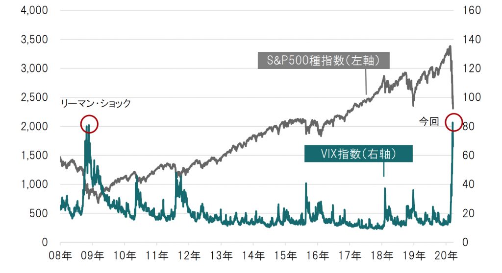 現在、新型コロナウィルス感染拡大の影響で、世界経済の成長率や企業業績の見通し引き下げが避けらないうえ、現時点ではどの程度影響がでるのかも予想しづらい状況にあります。また、3月に入ってから欧州や米国においても感染が拡大しており、局面は大きく変わっています。VIX指数の高まりは、こうした環境における投資家の不安心理の極度の高まりを反映しているとみられます。