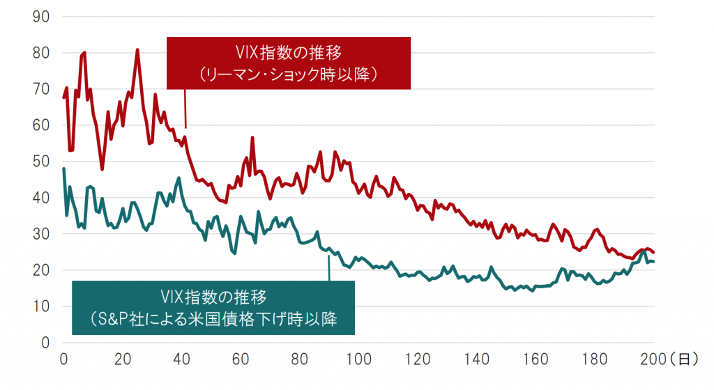 なお、過去において、VIX指数が急騰した後、どのような推移となっていったのかを示したものが下図です。ここでは「リーマンショック時」と「S&P社による米国債格下げ時」から200日間のVIX指数の推移を示しています。数値のレベル間はありますが、両局面の推移を見ると、100日間程度が経過するまでの間、VIX指数の変動が比較的大きい状況が続き、それ以降はやや落ち着き処を探るような動きがみられていました。