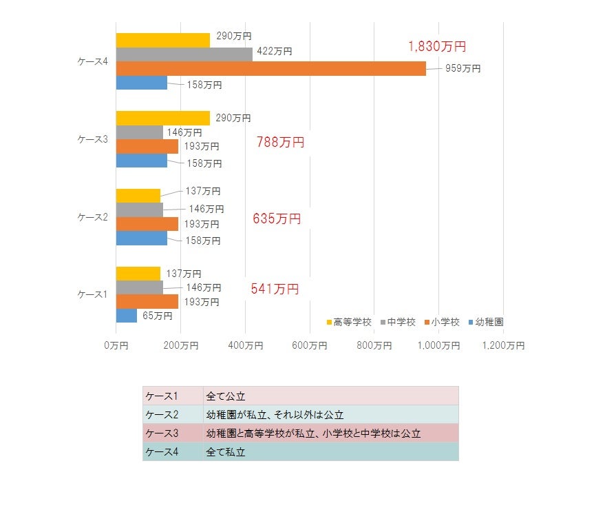 ケース1(全て公立)は541万円、ケース2(幼稚園は私立、それ以外は公立)は635万円、ケース3(幼稚園と高等学校が私立、小学校と中学校は公立)は788万円、ケース4(全て私立)は1,830万円という結果になりました。こうやってみると、どのケースもそれなりにお金がかかる印象です。因みに、ケース3が最も多いとのことでした。