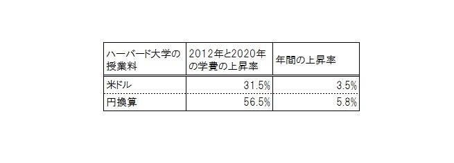 番外編として、ハーバード大学の授業料の推移についても掲載したいと思います。2012年の年間の学費は36,305ドルであったのに対し、2020年の学費は47,730ドルとなっています。8年間で31.5%上昇しており、1年間当たりでみると3.5%の上昇となっています(図表2)。これは、日本の私立大学の学費の上昇率よりも速いペースです。では、ドルベースではなく日本円に換算した場合はどうなるでしょうか。