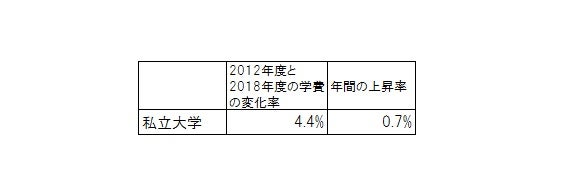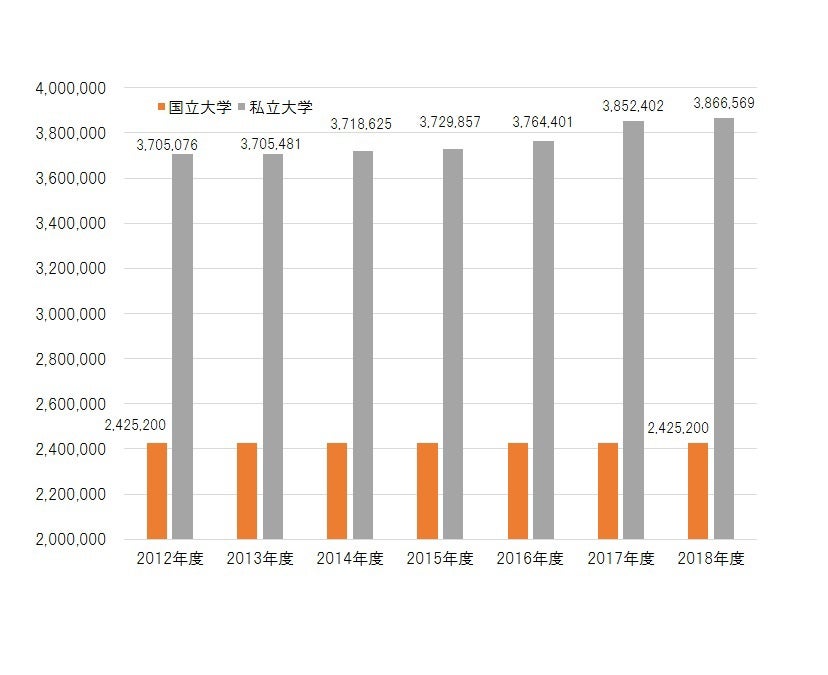 国立大学の入学金と授業料の合計は、2012年度から2,425,200円で据え置きとなっています。一方、2018年度の私立大学の入学金と4年間の授業料の合計は3,866,569円となり、2012年度の3,705,076円と比べて、4.4%上昇しています。一年間当たりでみると0.7%の上昇となりました(図表1)。