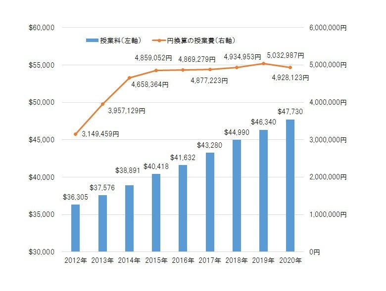 図表2:ハーバード大学の学費の推移(期間:2012年~2020年、各年の年末時点ドル円レートを使用)