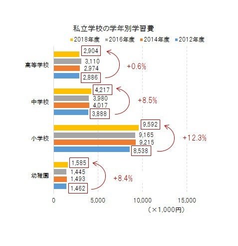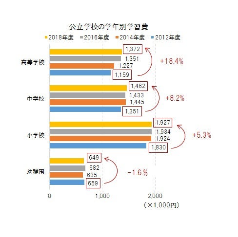 (期間:2012年度~2018年度、学年別学習費は各学年の就学年数の合計)
