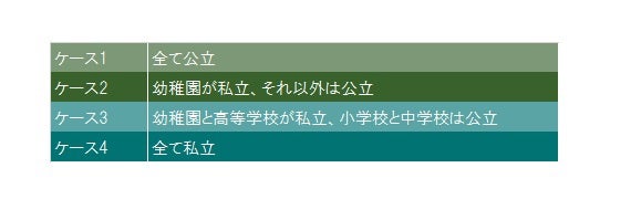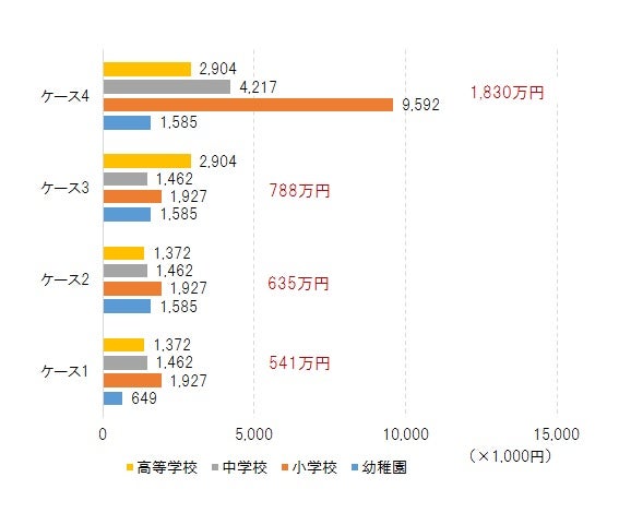 文部科学省から発表されている「子供の学習費調査(平成30年度版)」によると、2018年度における幼稚園から高等学校を卒業するまでの15年間の学習費総額は図表1の通りとなりました。最も学習費がかかるケース4で1,830万円、また最も多いケース3で788万円となります。