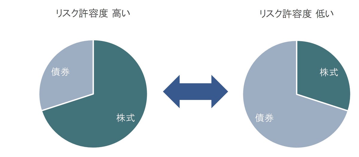 本題に入る前に、ポートフォリオ構築の基礎的な考え方についてご説明します。通常ポートフォリオを構築する際、投資家のリスク許容度やリスク選好度に応じて、株式と債券の組み合わせ比率を決定します。これをアセット・アロケーションと呼び、長期的な運用成果の約9割を決定するといわれています。一般的には投資家のリスク許容度が低く安定的な運用を行いたい場合は、債券の割合が高く株式の割合が低くなり、逆にリスク許容度が高く積極的な運用を行いたい場合は、債券の割合は低く株式の割合は高くなります(図表2)。
