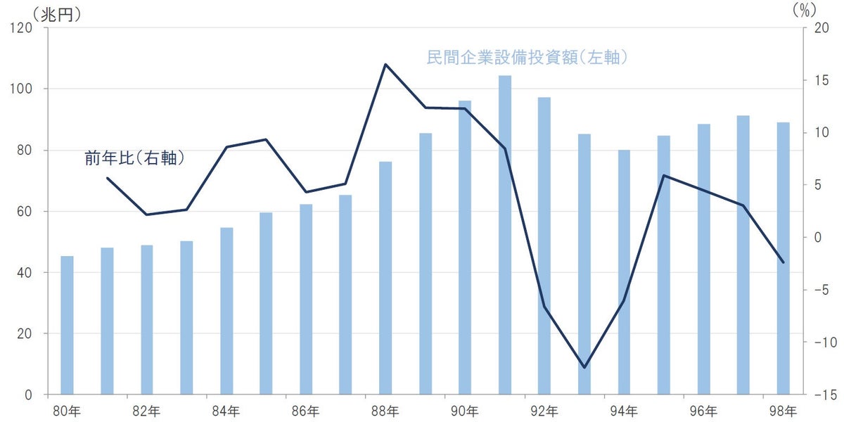 図表3:民間企業設備投資額(GDPベース)と前年比の推移(年次、1980年~1998年)