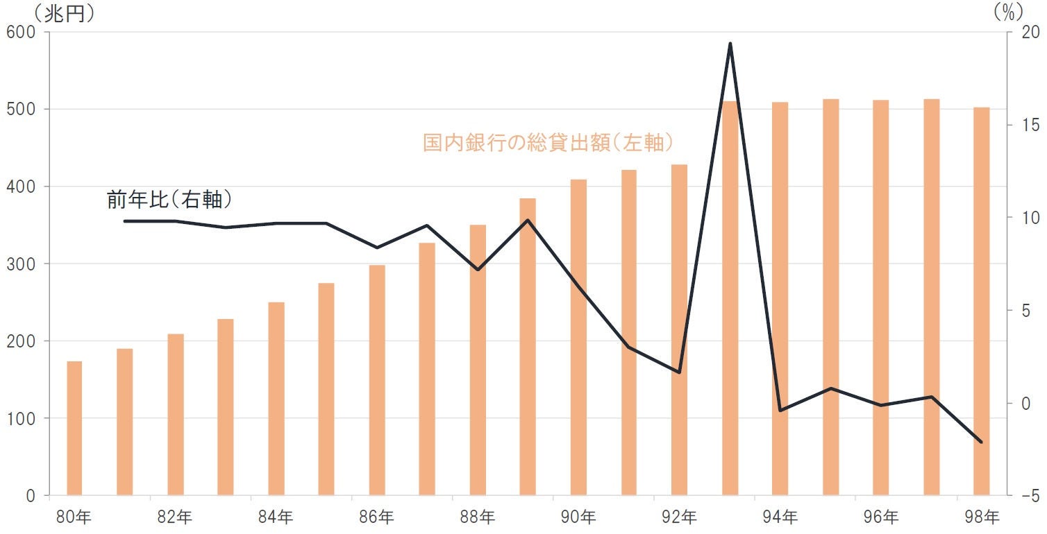 図表2:国内銀行の総貸出額と前年比の推移(年次、1980年~1998年)