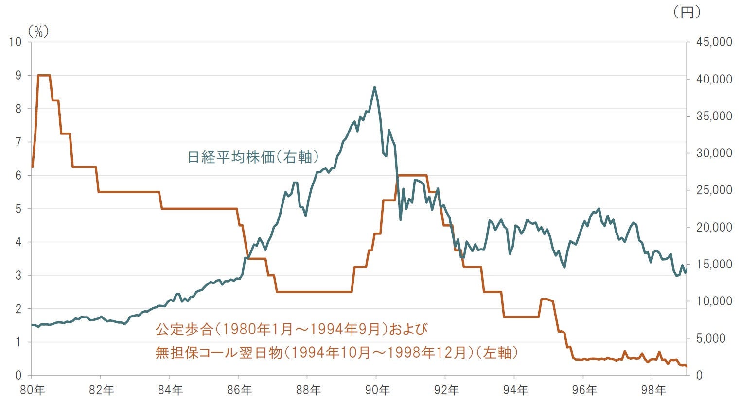 図表1:公定歩合および無担保コール翌日物と日経平均株価の推移(月次、1980年1月~1998年12月)