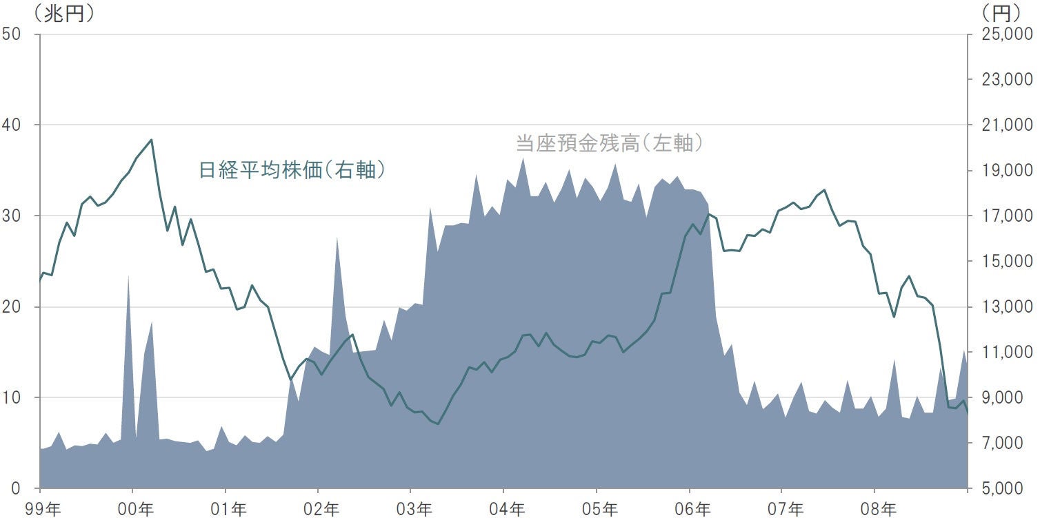 図表3:日本銀行当座預金残高と日経平均株価の推移(月次、1999年~2008年)