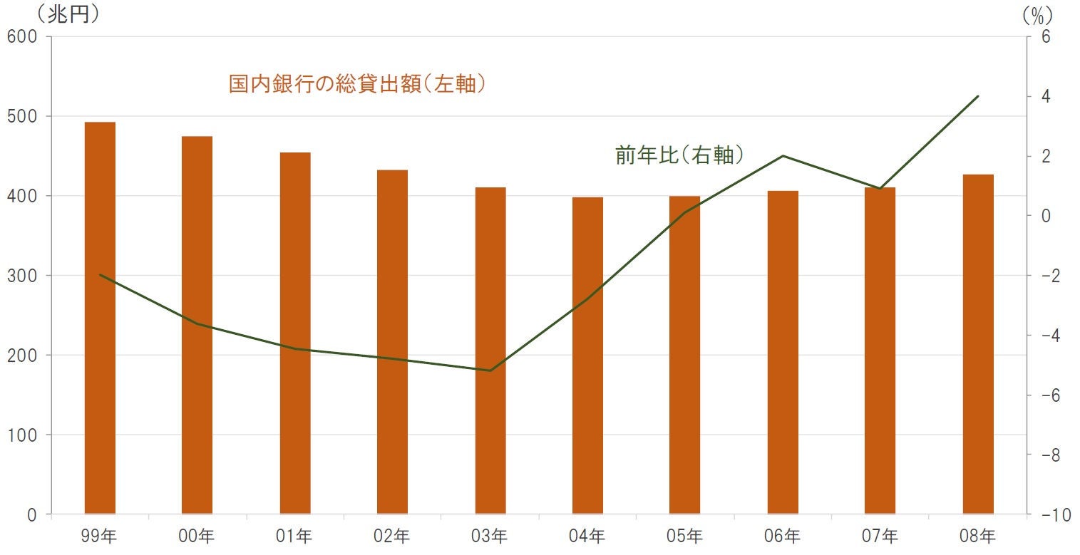 図表2:国内銀行の総貸出額と前年比の推移(年次、1999年~2008年)