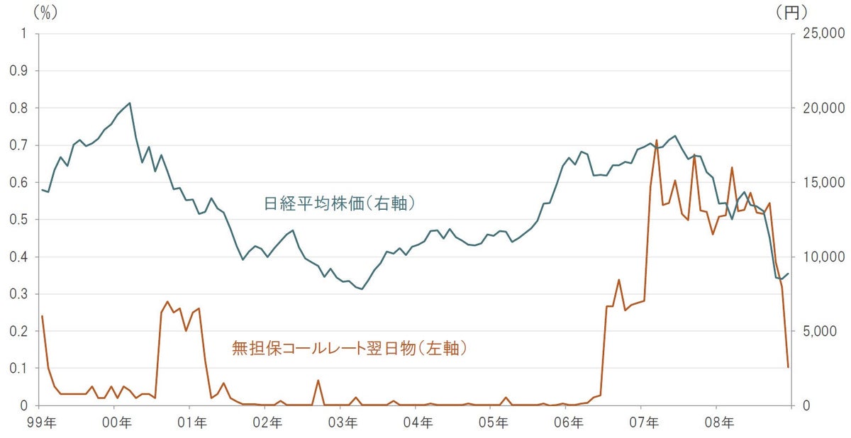 図表1:無担保コールレート翌日物と日経平均株価の推移(月次、1999年1月~2008年12月)