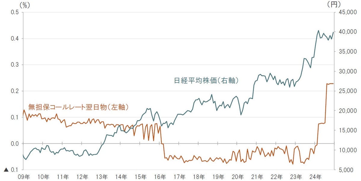 図表1:無担保コールレート翌日物と日経平均株価の推移