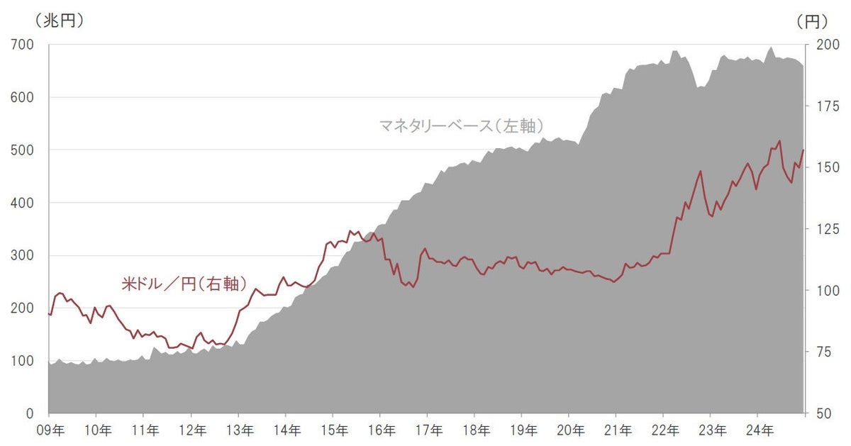 (月次、2009年1月~2024年12月、マネタリーベースは月末残高)