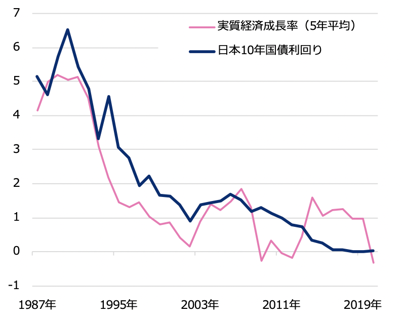 図表1:日本の実質経済成⻑率と10年国債利回りの推移