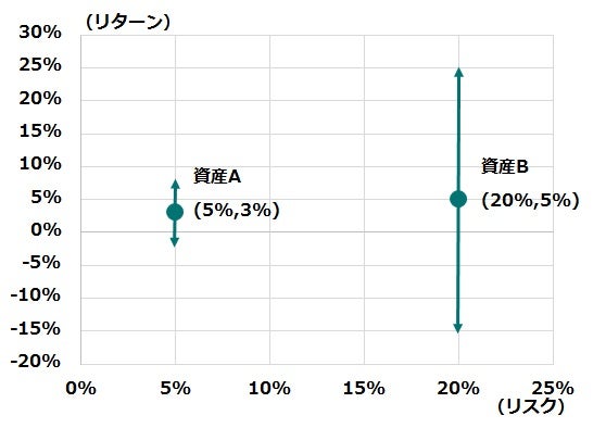リスク/リターンが、5%/3%の資産Aと20%/5%の資産Bがあったとします(図表1)。1年後のリターンは、資産Aがだいたい8%~-2%、資産Bがだいたい25%~-15%に収まると考えられます。また金融危機時などの最悪のケースでは通常の3倍程度にリスクが拡大する可能性があり、資産Aは15%くらい、資産Bは60%くらいの下落を覚悟する必要があります。このように資産によって、リスク/リターンの水準は大きく異なります。投資を始める際には、自分のリスク許容度や投資期間、投資金額に応じて、どのくらいのリスクをとるかを決めましょう。
