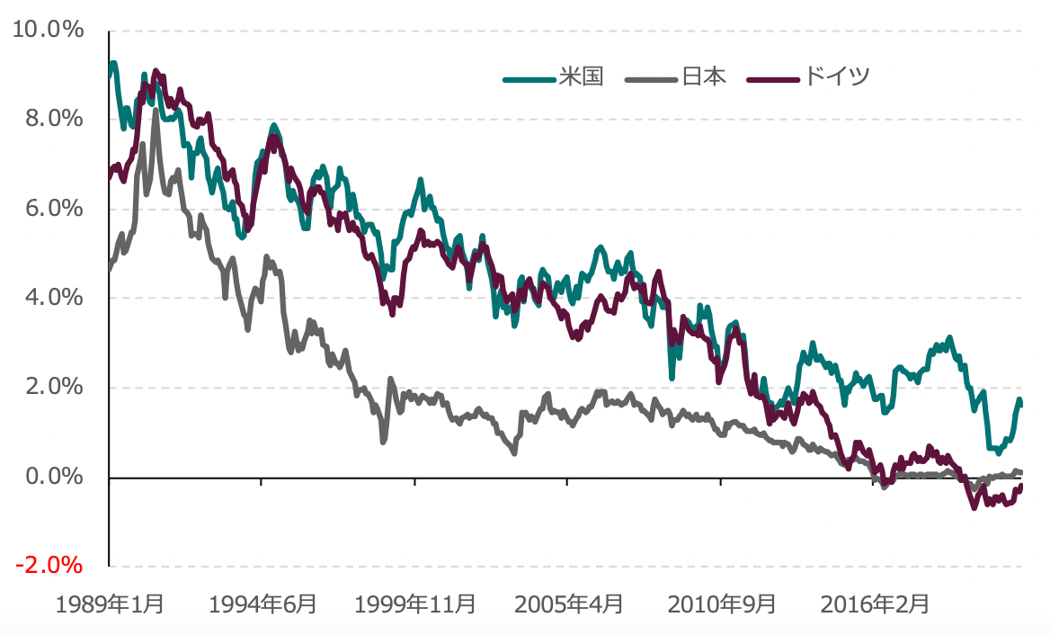 図表1:主要先進国の10年国債利回りの推移(期間:1989年1月〜2021年4月、月次)