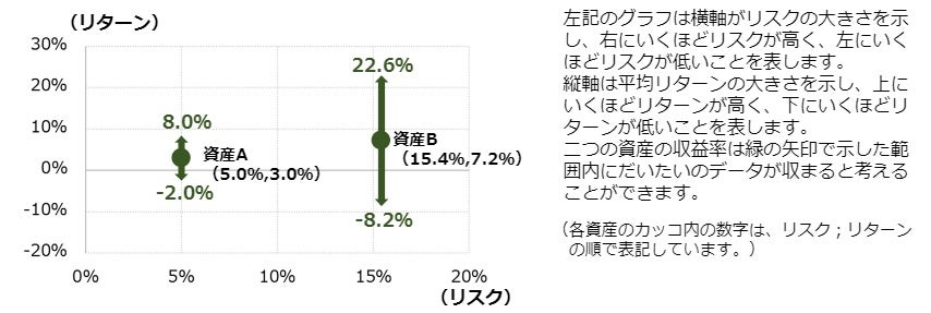 投資のリスクの大きさを把握するには「標準偏差」の考え方が役に立ちます。標準偏差は「バラつきの大きさ」を表す数字です。リスクの大きさを数値化するものであり、「極端なケースを除き、だいたい※このくらいの範囲の中に収まる」という範囲を教えてくれます。例えば、ある投資信託のリターンが年率7.2%、リスク(標準偏差)が年率15.4%と示されていた場合、1年あたりのリターンの平均値が7.2%で、これにリスク(標準偏差)の15.4%を足した22.6%と、引いた-8.2%の範囲内にだいたいのリターンが収まったということになります(図表1 資産B)。