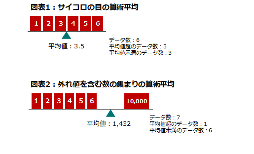「平均」とは、数字の集まりの傾向をつかむために、全体的にならすとどのくらいになるか、を計算するものです。「平均」には様々な種類がありますが、一般的な平均は「算術平均(相加平均)」というもので、対象となる全てのデータを合計(相加)して、データの個数で割ることで求められます。例えば、図表1に示すように算術平均で算出したサイコロの目の平均値は(1+2+3+4+5+6)÷6=3.5 となります。この場合、全部で6つあるデータのうち平均値の3.5を上回るデータ数と下回るデータ数はそれぞれ3つで、一般的に「平均」という言葉からイメージされる「並」や「だいたい真ん中あたり」に近いものになっています。一方、算術平均は、数字の集まりの中に極端に大きな、もしくは小さな数字(外れ値)があった場合、その数字の影響を受けやすいという性格があり、場合によっては平均値が「並」や「だいたい真ん中あたり」とはかけ離れた数字になります。図表2は、図表1に外れ値となる数字の10,000を加えたものです。平均値は1,432ですが、平均値を上回るのデータは1つ(10,000)のみであり、残りの6つのデータは平均値を大きく下回ります。