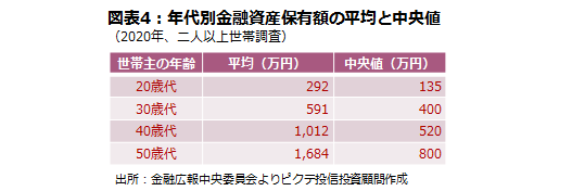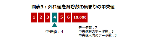 上述の金融資産保有額などの平均が実感できる「並」の金額よりも高額だと感じられるのは、これらの平均金額が、外れ値に相当する少数の富裕層(高額資産保有世帯)の存在によって大きく引き上げられたためです。この平均に代わって「並」をよく表してくれるのが「中央値」です。中央値はデータを大きさの順に並べた時に中央にくる数字です(データ数が偶数個の場合は中央2つの数字の算術平均)。中央値よりも大きな数字と⼩さな数字のデータ数が同じになり、一般的に「平均」という言葉がイメージさせる「並」や「だいたい真ん中あたり」に近い数字になります。図表1に示したサイコロの目の中央値は3.5で変わりませんが※、図表3に示すように外れ値を含む数字の集まりの中央値は4で、中央値を上回るデータ数と下回るデータ数が同じになります。年代別の金融資産保有額の中央値は30歳代で400万円、40歳代で520万円、50歳代で800万円です。「世間の平均的な額」として、より実感を伴う水準に近づいたのではないでしょうか。