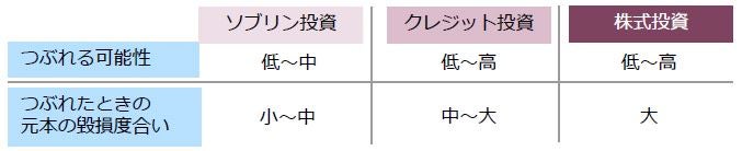 各資産ごとのリスクの⼤⼩について確認しましょう。クレジット投資は、国債に投資するソブリン投資よりも⼀般的にリスクが⾼くなります。⼀⽅、株式投資と⽐較しても、クレジット投資の種類によっては株式並みのリスクを取ることがあります。