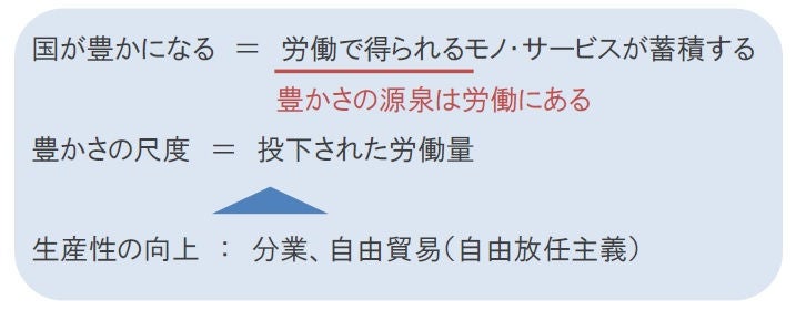 また、アダム・スミスは産業や貿易に国家が関与しない、自由貿易や自由競争を主張しましたが、これは制限のない資本投下(設備投資)や資本形成が生産性をより向上させると考えたからです。労働価値説に基づいて、価値は投下された労働量で決まるとすれば、さまざまな産業注に資本が投入され、多くの労働の機会をつくる必要があります。このようにして、労働の機会が増え、多くの人が労働に参加すれば国が豊かになるとアダム・スミスは考え、国家による管理や介入を批判しました。
