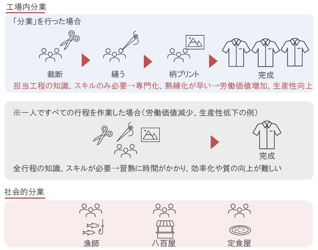 生産性の向上を説いた理論の一つが「分業」です。アダム・スミスは国富論において、パンの生産工場を例に、一人ひとりが役割分担をせずにただ漠然と作業をするよりは、工程ごとに人員を割り振り、それぞれが割り振られた作業だけを行う方が生産効率が上がるとして、「工場内分業」を推奨しました。同時に、社会全体を見たときに、存在するさまざま職業自体も「社会的分業」であると捉えました。一人ひとりが特定の作業や職業に特化することで労働の価値が上がる、つまり生産性の向上や各分野における専門化の進展が期待でき、それに伴う市場の成熟が社会全体の経済成長、つまり国の豊かさにつながるという考えました。分業についてシャツの生産を例にイメージしたものが図表3になります。