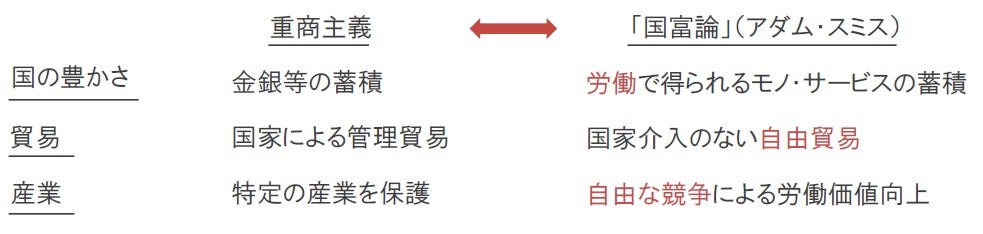アダム・スミスの考え方は重商主義批判に基づきます。重商主義について簡単に振り返ると、国が豊かになるためには金、銀等の獲得、蓄積が重要であり、そのために商業中心の経済政策を執り、国家が積極的に貿易や国内産業に介入する必要があるという経済思想です。一方、アダム・スミスは国の豊かさについて、労働によって得られるモノやサービスの蓄積こそが真の豊かさだと考え、豊かさの源泉を労働とする労働価値説を主張しました。より多くのモノやサービスが蓄積するためには生産性を上げる必要があり、それはすなわち労働の価値の向上を意味します(図表1)。また、労働価値説では、モノの価値の尺度を金、銀等ではなく、そのモノを生産するために投下された労働量に求めました。金、銀等はあくまでモノと交換する手段にすぎず、モノの価値は労働によって決まるとする考えです。さらに、産業や貿易への国家介入についても、モノやサービスが国内に入ってこなくなることに加え、他国との競争力を弱め、生産性を下げるとし、規制のない自由貿易を主張しました(図表2)。では、アダム・スミスが考えた、豊かさの源泉である労働の価値を高めるため、つまり生産性を高める経済理論とは具体的にどういうものだったのか、確認してきましょう。