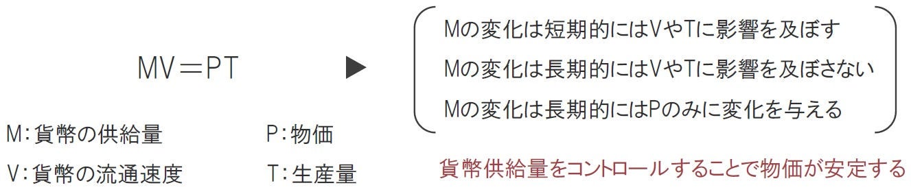 前述のスタグフレーションを受け、ケインズ派の経済政策への見直しや批判が高まる中、台頭した経済思想がマネタリズムであり、著名な論客としてミルトン・フリードマンがあげられます。フリードマンは国営企業の民営化や財政出動(公共事業等)の縮小、規制緩和等により政府の役割を小さくし(小さな政府)、かつての自由放任主義に倣い、市場メカニズムに経済を委ねることを主張しました。また、「貨幣数量説(図表2)」に基づき、国内物価や人々の所得に影響を与えるのは貨幣供給量であり、これをコントロールすることで物価や所得の変動に対応できると説きました。これがマネタリズムの基本的な考え方になります。フリードマンは政府による裁量的な財政出動はその効果が限定的で長期的には作用せず、むしろ悪いインフレを招くだけであると考えました。さらに、ケインズの経済思想において、財政出動のみならず、利子率の引き下げにより投資や需要を刺激することも重要な政策でしたが、フリードマンはこれも批判的に捉えており、利子率はあくまで貨幣供給量をコントロールした結果にしかすぎず、なによりも貨幣供給量の安定化が景気の安定をもたらすと主張しています。しかしながら、このようなフリードマンはじめ、マネタリズムの基本的思想には欠点があるともいわれています。それは自由な経済競争を促す故の格差拡大です。経済思想史③でご説明した通り、社会主義的思想が誕生した経緯である資本家と労働者の格差拡大は資本主義的な自由経済が要因となるものでした。そのため、政府介入のない、自由放任主義を再評価するマネタリズムにおいては、経済発展の裏で格差拡大を助長する可能性があるといえます。