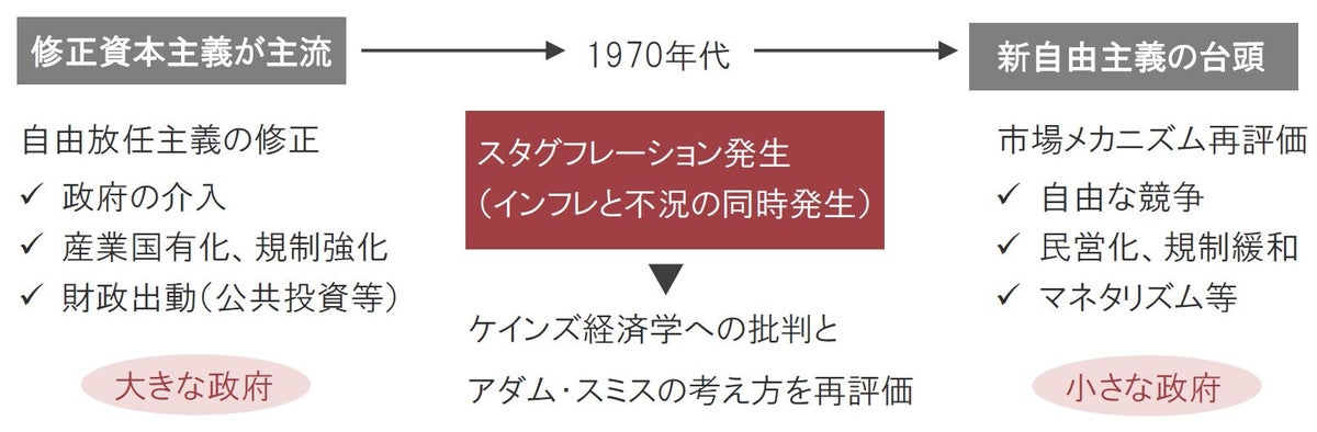 1970年代に発生したスタグフレーションを受け、それまで主流だったケインズ型の経済政策への批判が高まり、かつての自由放任主義を再評価する思想が広まりました。