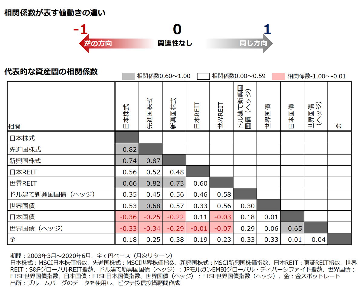 代表的な資産間の実際の相関係数を⾒てみると、例えば「⽇本株式」と「先進国株式」の相関係数は0.82と非常に高く、同じ⽅向に動く(=分散効果が小さい)ことがわかります。また、「⽇本株式」と「世界REIT」は異なる地域の異なる資産ですが、相関係数は0.66とかなり高く、分散効果はあまり高くないことがわかります。