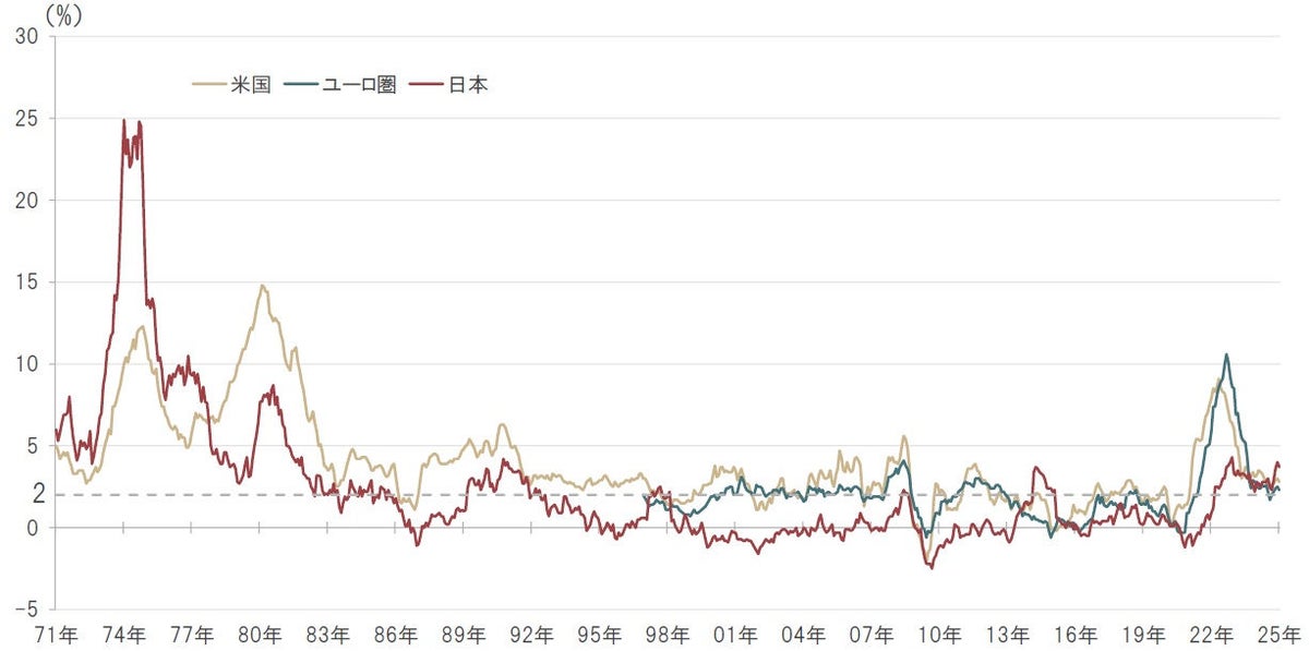 (前年同月比、1971年2月~2025年2月、ユーロ圏は1998年12月以降)