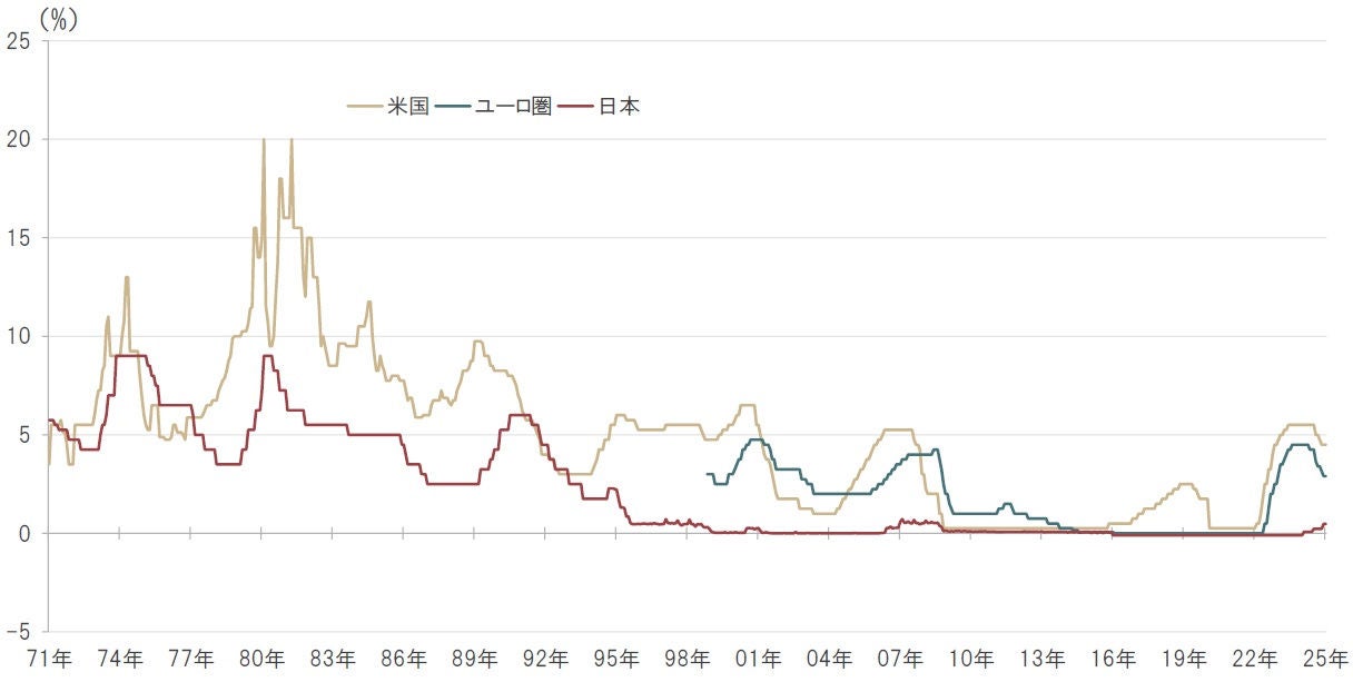 急激に進行したインフレを沈静化させるため、日本を除く多くの国々が政策金利の引き上げを行いました。米国のFRBは2022年3月より利上げを開始し、0.0~0.25%だった政策金利は途中、4会合連続で0.75%の利上げが行われる等、非常に早いピッチで進み、2023年7月には5.25~5.5%まで引き上げられました。ユーロ圏においてもECBが2022年7月より利上げを開始、0%だった政策金利(主要リファイナンス・オペ金利)は2023年9月には4.5%まで引き上げられました(図表2)。一方、日本でも同期間にインフレが進行しましたが、欧米諸国に比べると相対的に大きな上昇ではなかったことや、日本銀行の金融政策決定会合において、インフレはコストプッシュ型であるが故に、持続的かつ安定的に物価目標を達成していく見込みが十分にないと判断され、継続的な賃上げ等による実体経済の回復により、賃金と物価の好循環が起きていると確認できるまで、緩和的スタンスを維持することが決定されました。その後、2024年3月の金融政策決定会合にて、先述の賃金と物価の好循環の強まりが確認されているとの認識が多くの政策委員会委員に共有され、2%の物価安定の目標が持続的、安定的に実現していくことが見通せる状況になったと判断され、マイナス金利の解除とイールドカーブ・コントロールの撤廃が行われました。2025年2月末時点での政策金利は0.5%となっています。