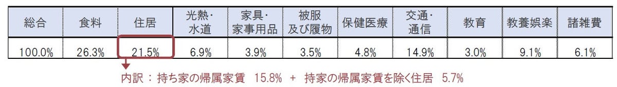 今回は日本のCPI(消費者物価指数)に焦点を当て、詳しくその変化を確認いたします。総務省より公表されるCPIは代表的なものとして、総合指数、コア指数(生鮮食品を除く総合指数)、コアコア指数(生鮮食品及びエネルギーを除く総合指数)の他、各品目別に詳細なデータが存在します。まず、物価全体の動向を確認する先述の代表的な3つ(総合、コア、コアコア)の指数に加え、持ち家の帰属家賃を除く総合指数を確認しましょう(図表1)。コア指数については、生鮮食品は天候に生産量が左右されやすく、価格の変動が他品目と比較して非常に大きいため、これを除くことで物価変動の基調を確認できます(図表2)。一方、エネルギーまで除くコアコア指数ですが、米国等ではこちらの定義注1がコア指数として利用されており、コア指数と併せて確認が必要です。持ち家の帰属家賃とは、持ち家を借家として仮定したうえで、持ち家から享受している住宅サービスの価値を見積もり、それを家賃と見なして、計上するものを指します。ただし、持ち家は実際に市場で売買されず、出費を伴うものではありません。かつ総合指数に占めるウエイトが15.8%あるため(図表3)、これを除いた出費ベースでの物価動向を確認することも重要です。また、帰属家賃そのものはここ数年、ほぼゼロ近辺で推移しているため、総合指数を押し下げる効果があることも理解する必要があります(図表2)。