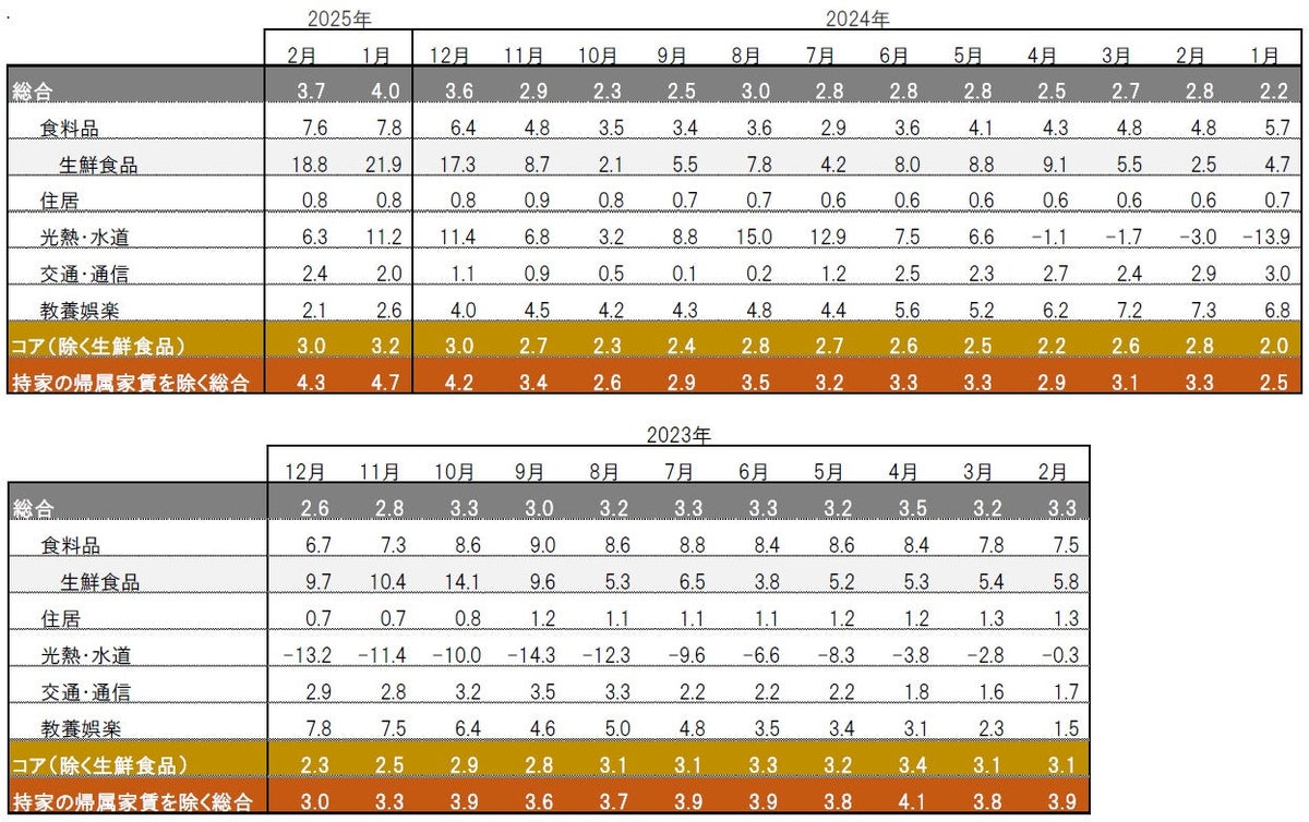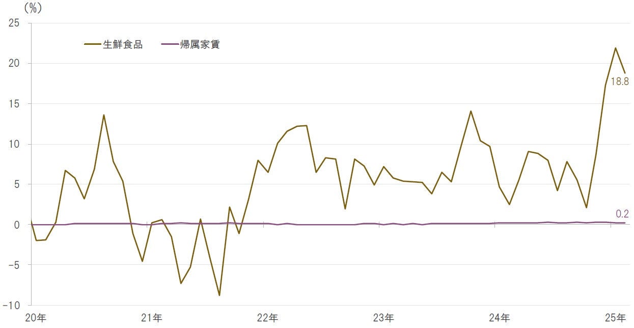 図表2:生鮮食品、帰属家賃の推移(前年同月比、2020年1月~2025年2月)