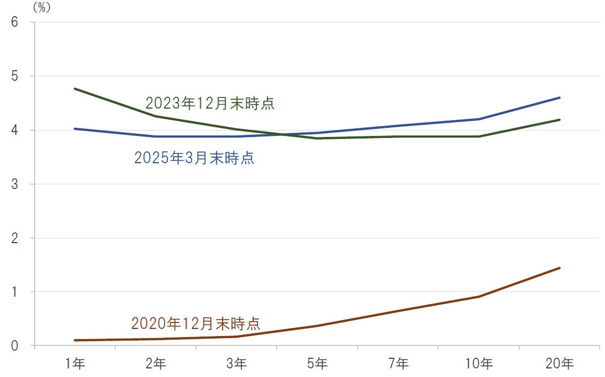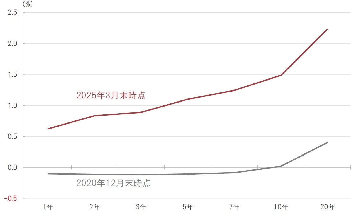 日本国債のイールドカーブを2020年12月末時点と2025年3月末時点を比較すると大きな変化があったことがわかります(図表2)。2020年12月末時点で、日本銀行による主な金融政策はマイナス金利、イールドカーブコントロール(10年国債の利回りをゼロ付近に抑える)でした。これにより10年未満の国債はほぼマイナスの利回りを示し、20年国債でも0.5%を下回る非常に低い利回りとなりました。しかしながら、その後、イールドカーブ・コントロールの運用が徐々に柔軟化され、2024年にマイナス金利の解除とイールドカーブ・コントロールの廃止が行われると、米国等の金利上昇の影響もあり、国債の利回りはどの年限でも上昇してきました。また、日本銀行が金融緩和の縮小を徐々に進める中、金融政策正常化の期待もあり、長期金利は上昇し、短期金利との差が拡大しました。