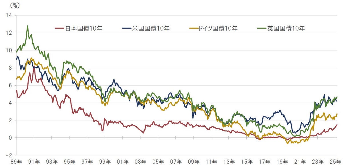 図表1:日本、米国、ドイツ、英国の10年国債利回りの推移(月次、1989年1月~2025年3月)