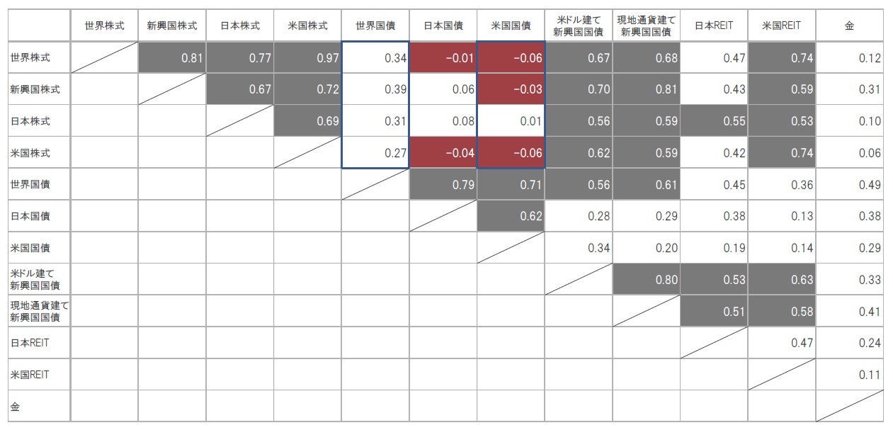 世界株式:MSCI世界株価指数、新興国株式:MSCI新興国株価指数、日本株式:MSCI日本株価指数、米国株式:MSCI米国株価指数、世界国債:FTSE世界国債指数、日本国債:FTSE日本国債指数、米国国債:FTSE米国国債指数、米ドル建て新興国国債:JPモルガンEMBI グローバル・ディバーシファイド指数、現地通貨建て新興国国債:JPモルガンGBI-EM グローバル・ディバーシファイド・コンポジット指数、日本REIT:S&P 日本REIT指数、米国REIT:FTSE NAREIT オール・エクイティREIT指数、金:ロンドン市場金価格 ※指数は全てトータルリターン