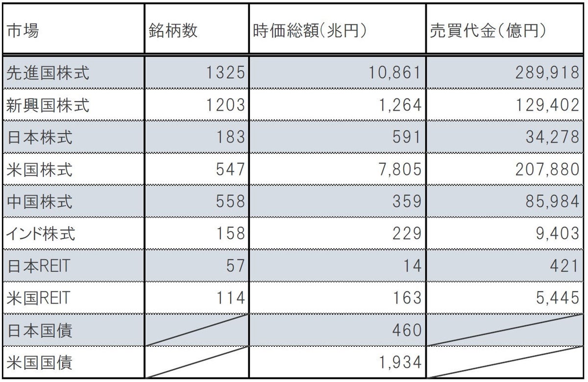 ※上記は市場を代表する指数の構成銘柄のデータであり、指数が表す市場全体を表すデータではありません。例えば、上記の日本国債の時価総額は460兆円となっていますが、これはあくまでもFTSE日本国債指数の構成銘柄の時価総額です。債券指数の場合は、償還まで1年未満の銘柄は構成銘柄に加えないなどの算出ルールがあり、そうした算出ルールに基づき計算された指数のデータを表示しています。