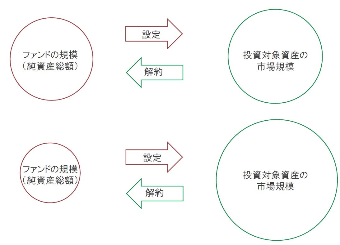 投資信託で運用する場合、投資先のファンドにおける流動性リスクの1つにファンドの規模があります。ファンドの規模が、そのファンドが投資対象とする資産の市場規模に対して大きすぎた場合、ファンドの設定・解約による資金流出入によって当該資産価格に大きく影響する可能性があります。たとえば、ファンドの純資産総額に比べてわずかな解約であっても、市場における1日の売買代金に対してその取引量が多い場合、需給のバランスを崩しかねません。その結果、適切な価格形成が行われず、場合によっては既述のように適正な価格から大きく下落した価格で取引を行わざるを得ない、もしくは取引が停止されるリスクもあります(図表1)。各市場の時価総額や1日あたりの売買代金を確認し(図表2)、ファンドの規模と比較しながらポートフォリオに入れるファンドを検討することも重要だといえます。