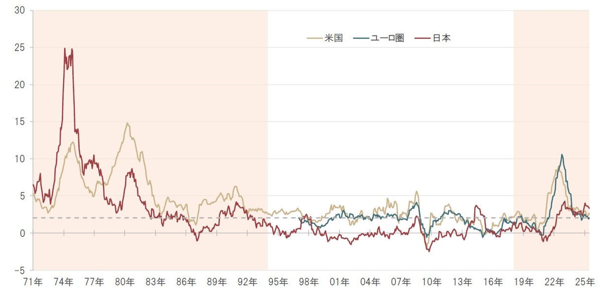 図表1で1971年から現在までの日米欧(ユーロ圏は1997年1月より)のインフレ率(前年同月比)推移を確認します。ピクテでは過去50年超の期間を①1971年から1990年代はじめ、②1990年代半ばから2017年ごろ、③2018年から現在までの3つに分け、それぞれの期間における物価変動の特徴として、①はインフレ期、②は物価低位安定期、そして③は再びインフレ期であると考えています。各期間の背景を探ると、①においては、第2次世界大戦後から続いた東西冷戦期間中、軍事費の拡大に伴う財政出動や公共投資、加えて2度にわたって発生したオイルショックが物価を押し上げました。日米のインフレ率はオイルショックの際に特に著しく上昇しましたが、平均的に見ても高い時代だったといえます。②においては、冷戦の終結に伴うグローバリゼーションの進展によって、国際サプライチェーンの構築が進展し、分業体制が確立したことで世の中の物価は安定しました。米国においては平均して2%程度でインフレ率が推移しました。一方、日本においてはバブル崩壊が経済に深刻な後遺症を与え、その後の投資や消費が大きく低迷したことや少子高齢化などの構造的な問題もあり長らくデフレの状態が続きました。③においては、第1次トランプ政権の誕生、貿易関税を巡る米中対立を筆頭にさまざまな脱グローバリゼーションの動きが活発化し、また、コロナショックによるサプライチェーンの分断やロシアのウクライナ侵攻がコモディティ価格を大きく上昇させ、再び物価が上昇しました。多くを輸入品に頼る日本においても、その影響は大きく、また日米の金融政策の違いから円安・米ドル高が急激に進行したこともありインフレ率は着実に上昇してきました。2025年6月の消費者物価指数は生鮮食品を除くコア指数が3.3%となっており、7ヵ月連続で3%を超えていることからインフレが定着しつつあるといえます。