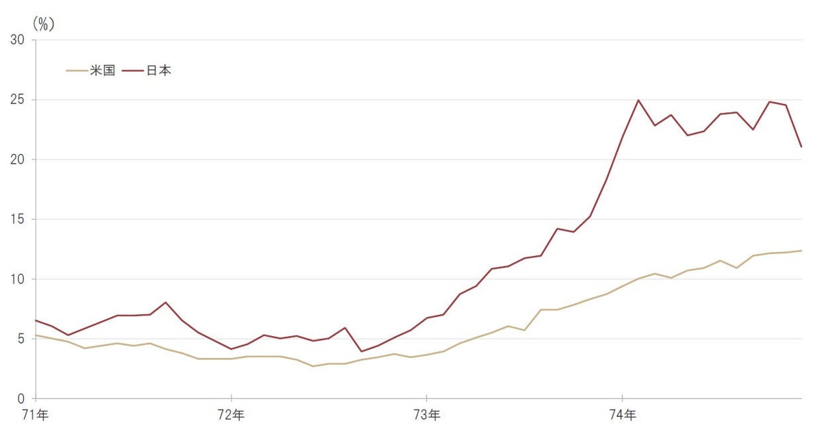 1973年の第四次中東戦争の際に、石油輸出国機構(OPEC)加盟産油国のうち、ペルシャ湾岸6ヵ国が米国やオランダ等、イスラエル支援国への原油輸出停止と原油生産量削減、さらに原油公示価格を1バレル3.01米ドルから5.12米ドルへ70%引き上げることを発表しました。さらに1974年1月になってOPEC加盟のペルシャ湾岸産油国は、原油公示価格を5.12米ドルから11.65米ドルに引き上げ、原油公示価格はほぼ4倍近くになり、これにより発生した激しいインフレと世界経済の悪化が第一次オイルショックです(図表2)。当時、日本は高度経済成長期にありましたが、このオイルショックにより完全に終焉し、深刻な景気後退とインフレに直面しました。当時、日本は25%近いインフレ率を記録し、米国でも10%を超えるインフレ率が記録されました(図表3)。
