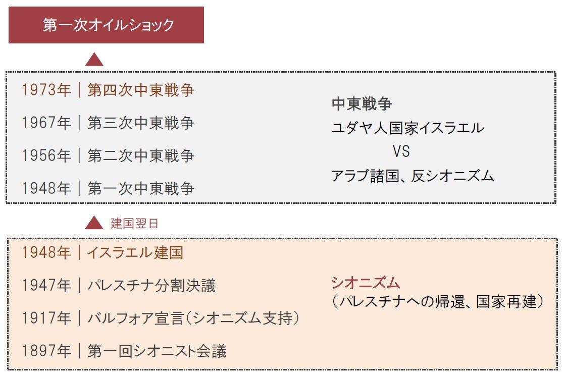 第一次オイルショックとは、1973年10月に起きた第四次中東戦争(イスラエルVSエジプト、シリア等のアラブ諸国)をきっかけとして、原油価格が約4倍に引き上げられたことによる世界経済の混乱のことです。「中東戦争」とは、ユダヤ人国家のイスラエルと周辺のアラブ諸国との間で1948年の第一次から1973年の第四次まで起きた大規模な戦争のことです。この戦争の歴史について概略を説明します(図表1)。19世紀末より、世界中に離散していたユダヤ人が、各地での迫害などをきっかけに、先祖の住んでいた聖地エルサレムのあるパレスチナに帰還し、そこにユダヤ人国家を建国しようとする運動が盛んになっていきました(シオニズム運動)。第一次世界大戦中の1917年11月、英国政府がシオニズム支持を表明したバルフォア宣言で英国政府はパレスチナにユダヤ人居住地を建設することに賛成しその支援を約束、ヨーロッパから多くのユダヤ人がパレスチナに向かいました。第二次世界大戦後の1947年11月に国連総会はパレスチナを分割してユダヤ人国家とアラブ人国家を置くパレスチナ分割決議を可決しました。ただし実際には決議後すぐに内戦が勃発し分割は実現しませんでした。1948年5月、英国・米国の支援を受けてイスラエルが独立を宣言、現在のイスラエルが建国されました。しかし周辺のアラブ諸国側はその独立を認めず、建国の翌日、イスラエルとアラブ諸国による第一次中東戦争が始まり、1973年までに四度の大規模戦争が発生しました。