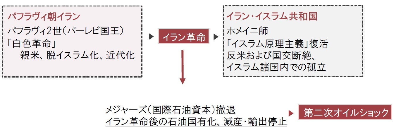 第二次オイルショックの主な要因となった1979年イラン革命について、詳細をご説明いたします。イラン革命とは文字通り、イラン国内で発生した政治的革命を指しますが、イランは当時、OPECの中でサウジアラビアに次ぐ第2位の石油生産国であり、世界への石油供給量もイランの割合は大きなウェイトを占めていました。第二次世界大戦後の冷戦の状況下、ソ連と対峙していた米国はパフラヴィ朝イランの2代目の皇帝であるパフラヴィ2世(パーレビ国王)に経済的・軍事的援助を行い、西側諸国の一員に組入れようとしました。パーレビ国王は、「白色革命」と呼ばれる脱イスラム化・近代化政策を採って、農地改革や女性の参政権、国営企業の民営化などを積極的に進めましたが、急激な改革は貧富の差の拡大を生み、国民の強い反発を招きました。加えて、伝統的なイスラム教の価値観と相反する近代化政策は、宗教勢力や保守派の反発を招きました。パーレビ国王は、国王批判をしたイスラム教指導者ホメイニ師を国外追放するなど、反対勢力の弾圧を行いましたが、抑えきれず翌79年1月にエジプトへ亡命せざるを得なくなり、国王批判をして国外追放されたホメイニ師が亡命先のフランスから帰国しイラン・イスラム共和国が樹立、パフラヴィ朝イランが消滅しました。これがイラン革命です。そして、先述のようにイラン・イスラム共和国が自国資源保護のため原油の大幅減産や輸出の一時停止を行ったことが第二次オイルショックが発生する大きな要因となりました(図表3)。