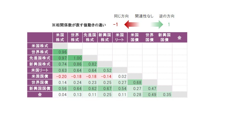 図表2に代表的な資産の相関係数を示しています。例えば「米国国債」と「米国株式」の相関係数は-0.20です。両資産は異なる値動きをする傾向があると言え、この二つの資産を組み合わせたポートフォリオは、米国株式を単体で保有するよりも値動きが抑えられる可能性が高くなります。一方、「新興国国債」と「米国株式」の相関係数は0.56と高く、同じような値動きをする傾向があるため、両資産を組み合わせた場合の分散効果は小さい可能性があります。このように、相関係数の大小を確認した上で投資資産の組み合わせを考えることが効果的な分散投資を実現する上で非常に重要だと言えます。