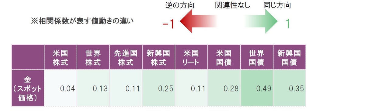 図表1: 金 スポット価格 と代表的な資産の相関係数